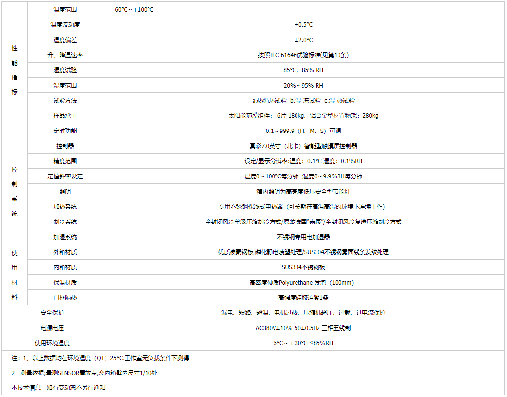 產(chǎn)品簡介:光伏濕凍試驗箱適用于光伏組件(太陽能電池板)做熱循環(huán)、濕凍循環(huán)、高溫高濕雙85試驗,以確認組件能否承受高溫高濕之后隨之的負溫度影響,以及對于溫度重復變化時引起的疲勞和熱失效,另外確定光伏組件曝露在高濕度下而產(chǎn)生的熱應力及能夠抵抗?jié)駳忾L期滲透的能力.是光伏組件行業(yè)必不可少的測試設(shè)備。