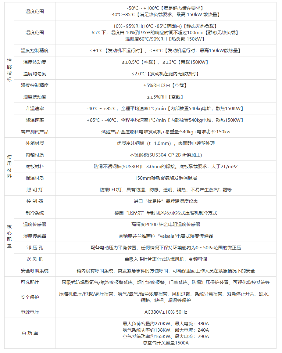 | 降溫速率 | +85℃~-40℃,全程平均速率1℃/min【內(nèi)部放置540kg電堆,散熱150KW】 | |