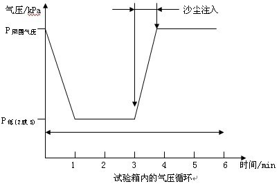 試驗用塵:試驗用塵是干燥的非磨蝕性的細(xì)粉塵,能夠通過篩孔為75µm,金屬絲直徑為50µm的平面網(wǎng)狀篩。本試驗中可以使用滑石粉,分析表明它可以滿足要求。試驗用塵使用次數(shù)不應(yīng)超過20次。應(yīng)注意維持干燥以保持粉塵細(xì)度,使用前應(yīng)在80℃下烘干2h. 塵濃度:試驗用塵的數(shù)量應(yīng)能夠使箱底基準(zhǔn)表面上的沉降量均勻維持在(600±200)µ/(m²•h)。 氣流:試驗箱內(nèi)的氣流應(yīng)主要是自上而下的垂直氣流,而非層流。 氣流速度:氣流速度應(yīng)能夠使塵在試驗箱內(nèi)均勻分布。 濕度:試驗箱內(nèi)的相對濕度應(yīng)小于15%?梢酝ㄟ^提高試驗箱濕度實現(xiàn)。 樣品內(nèi)氣壓:根據(jù)樣品的運行條件,樣品外殼可以分為兩種類型: 類型1:樣品外殼內(nèi)的氣壓可能會與外界大氣壓不同,例如由運行中的熱力循環(huán)引起氣壓不同。 類型2:樣品外殼內(nèi)的氣壓跟外界氣壓相同。 相關(guān)規(guī)范應(yīng)闡明樣品外殼類型和壓力降。 砂塵試驗箱對于具有類型1外殼的樣品,應(yīng)放入試驗箱,并按照正常使用位置安裝。樣品應(yīng)承受圖中規(guī)定的壓降周期。根據(jù)相關(guān)規(guī)范中規(guī)定,壓力降應(yīng)為2kPa(20mbar)或5kPa(50mbar) 。 如圖所示,塵應(yīng)在每個循環(huán)周期內(nèi)注入。 對于具有類型2外殼的樣品,應(yīng)放入試驗箱,并按照正常使用位置安裝。此種情況下,不應(yīng)使用真空泵。