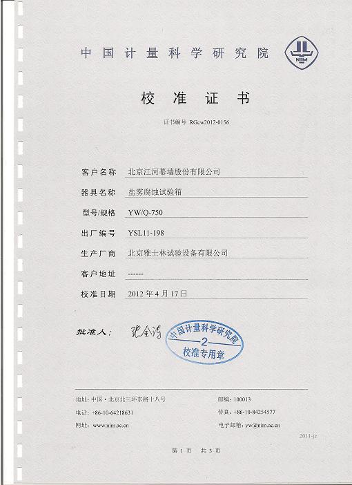 >>鹽霧腐蝕試驗箱校準證書-中國計量院-江河幕墻
