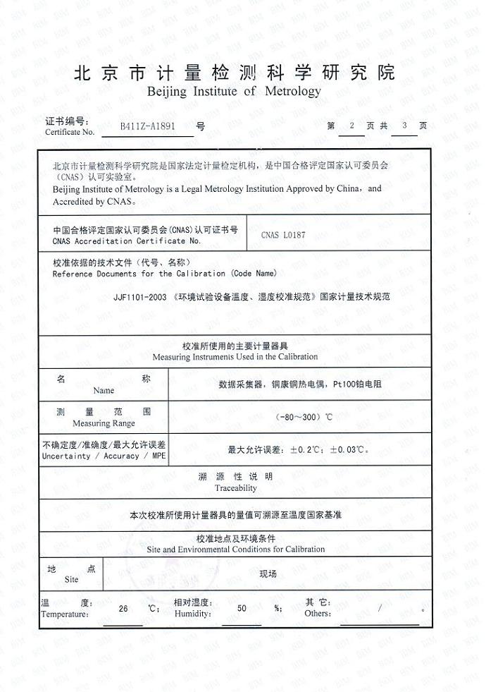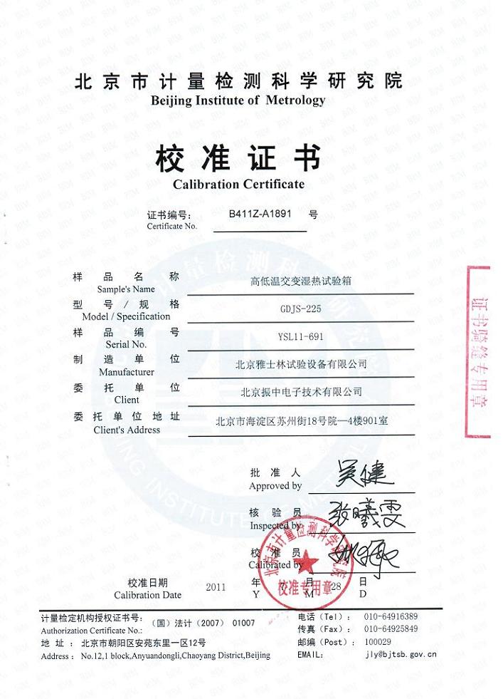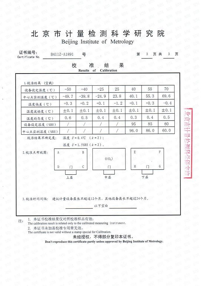 高低溫交變濕熱試驗箱校準(zhǔn)證書-北京計量院-振中電子