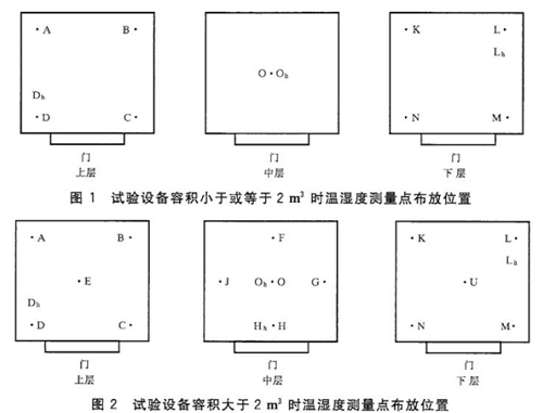 恒溫恒濕試驗箱濕度測量儀器采用干濕球溫度計或由其他濕度傳感器組成的濕度測量系統(tǒng),其測量結(jié)果的擴(kuò)展不確定度不大于被測溫度允許偏差的1/3。 恒溫恒濕試驗箱濕度測量點(diǎn)數(shù)量及位置要求: 一,根據(jù)試驗設(shè)備容積的大小,將工作空間分為上、中、下三層,中層通過工作空間幾何中心點(diǎn),將一定數(shù)量的相對濕度傳感器布放在其中規(guī)定的位置上,傳感器不應(yīng)受冷熱源的直接輻射。 二、相對濕度測量點(diǎn)用Oh、Dh、Hh、Lh表示。Oh位于中層的幾何心心,其他各測量點(diǎn)與試驗設(shè)備內(nèi)壁的距離為各自邊長的1/10,但最大距離不大于500mm,最小距離不小于50mm。 三、恒溫恒濕試驗箱容積小于或等于2m3時,相對濕度測量點(diǎn)為3個,如圖1所示。試驗箱容積大于2m3時,相對濕度測量點(diǎn)為4個,如圖2所示。當(dāng)試驗箱容積小于0.05 m3或大于50 m3時,可適當(dāng)減少或增加測量點(diǎn)。 四、每5min溫度平均變化速率測量點(diǎn)為工作空間幾何中心點(diǎn)。