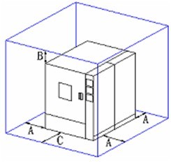 9、高低溫試驗(yàn)箱周圍應(yīng)留有適當(dāng)?shù)氖褂眉熬S護(hù)空間,如下圖所示:注:A:不小于60cm B:不小于60cm C: 不小于70cm