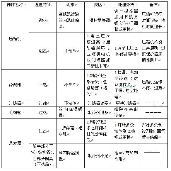 眾所周知,溫度是表示物體的冷熱程度的物理量,是制冷工程的一個(gè)重要的技術(shù)參數(shù)。高低溫試驗(yàn)箱的主要部件是:壓縮機(jī)、冷凝器、過(guò)濾器、毛細(xì)管、蒸發(fā)器等,也就是說(shuō),他們的工作溫度特征反映了整個(gè)制冷系統(tǒng)的運(yùn)行狀況。我們?cè)谂袛?strong>高低溫試驗(yàn)箱是否存在故障時(shí),最行之有效的方法就是用手去摸各部件的表面溫度。然而,他們的溫度特征怎樣才算正常,請(qǐng)看下表。