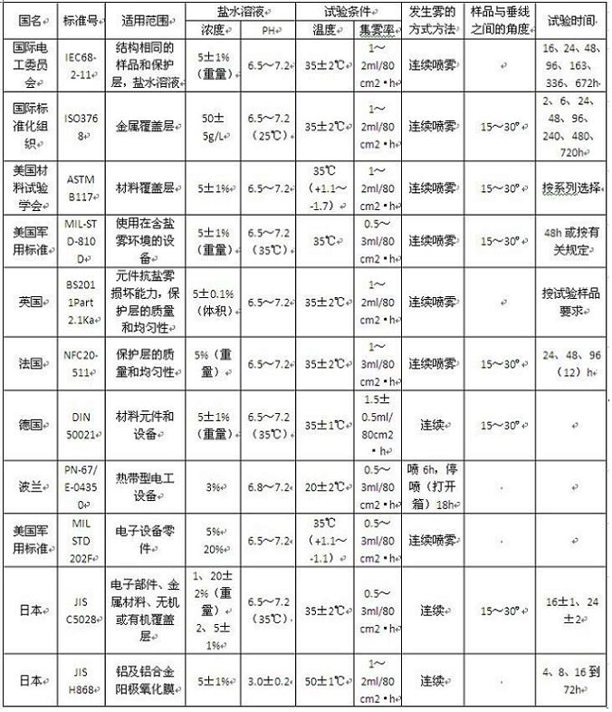 鹽霧試驗(yàn)箱各國(guó)標(biāo)準(zhǔn)試驗(yàn)方法對(duì)照表如下: