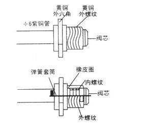購(gòu)單向閥一支,結(jié)構(gòu)見下圖。取下單向閥的閥芯,把單向閥焊在高低溫試驗(yàn)箱的工藝管上。確認(rèn)焊接牢固、無漏,再裝上閥芯。抽真空時(shí)用帶有頂針的加氟管連結(jié),另一頭與角閥連接。然后再接表和真空泵。抽真空后,卸下真空泵,換上加氟鋼瓶,排除角閥后(第二根加氟管)加氟管中的空氣,再加氟。