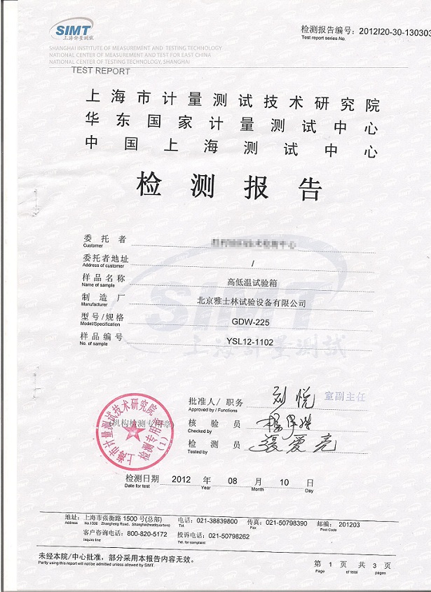 >>高低溫試驗箱檢測報告模板下載--上海計量院