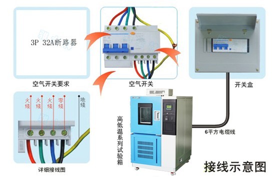 高低溫試驗箱的電源要求是AC380V±10% 50±0.5Hz 三相五線制,并要求用戶在安裝現(xiàn)場為設(shè)備配置相應(yīng)容量的空氣或動力開關(guān),并且此開關(guān)必須是獨立供本設(shè)備使用(建議電源開關(guān)容量:32A),其具體接線方式如下: